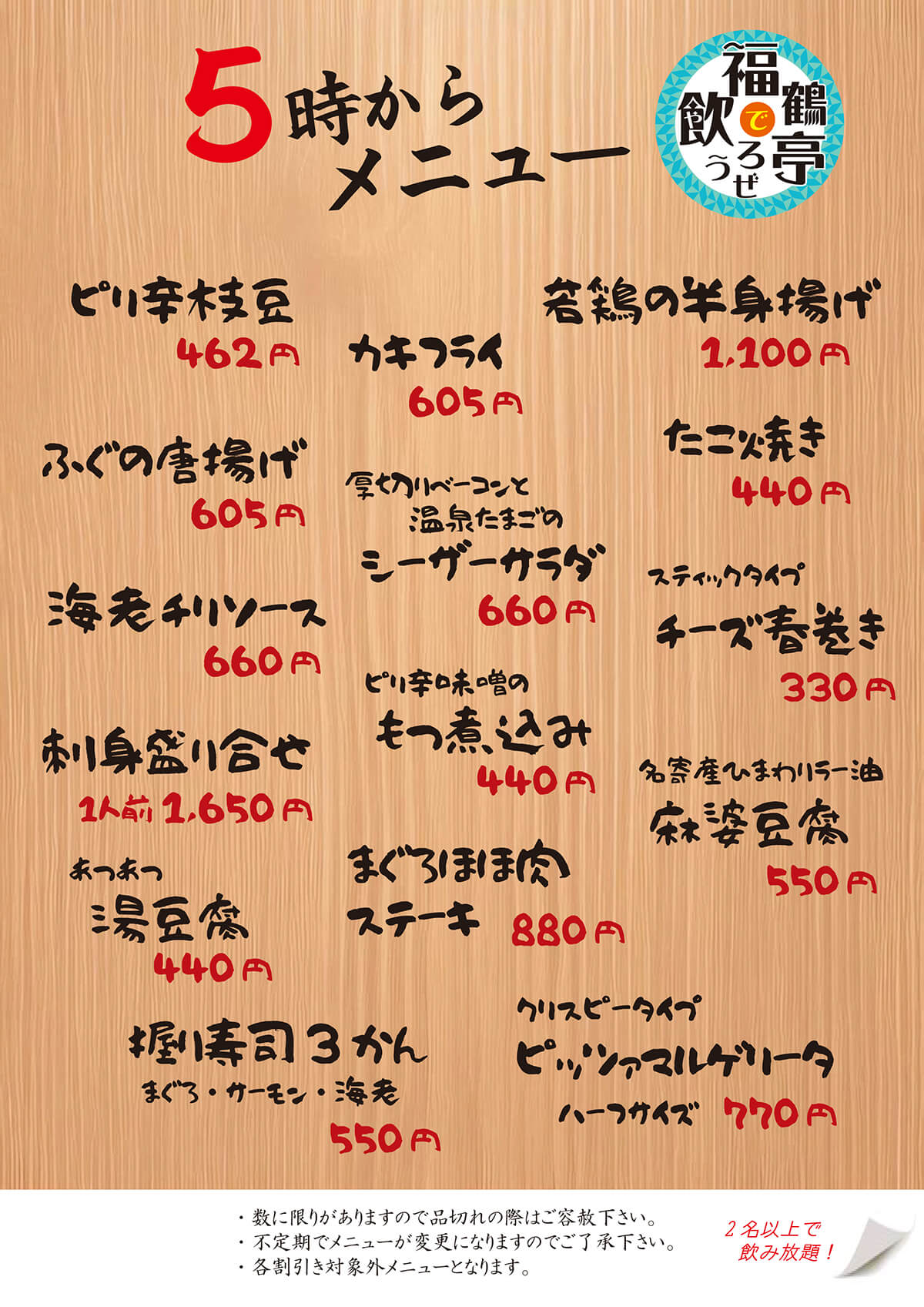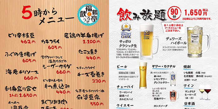 レストラン福鶴亭 「5時からメニュー」少人数での飲み会に最適です 2名以上で飲み放題もセットにできます。 ご家族・カップル・お友達で楽しいひと時を! 4名様以上はご予約をおすすめいたします。 レストラン福鶴亭 オフィシャルサイトはこちら 前のページ おすすめ情報 次のページ