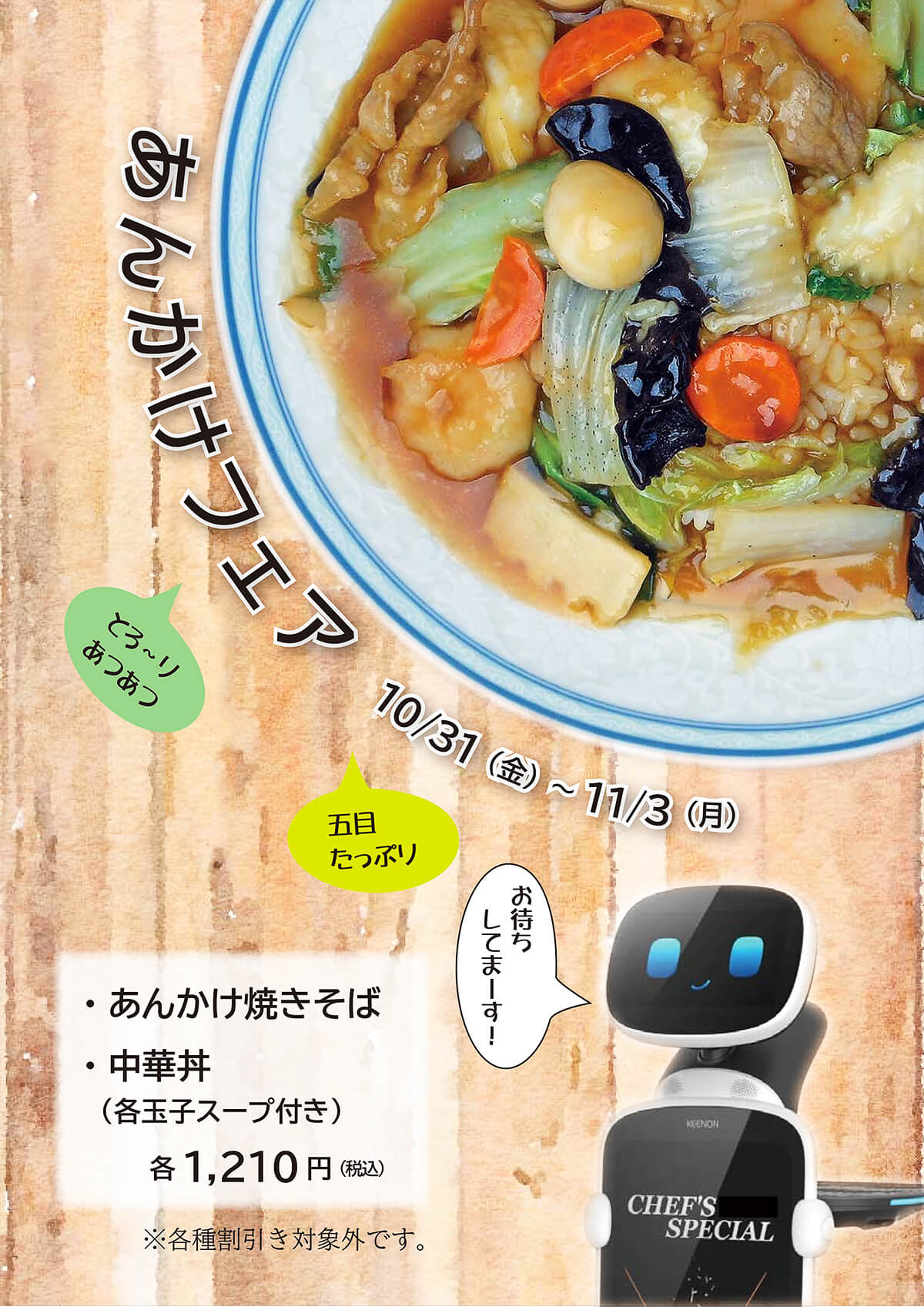 寒い季節にぴったりの熱々「あんかけフェア」 10月31日から期間限定で「あんかけフェア」を開催。 身体が温まる「あんかけ焼きそば」と「中華丼」をこの機会に一度お試しください! 前のページ おすすめ情報
