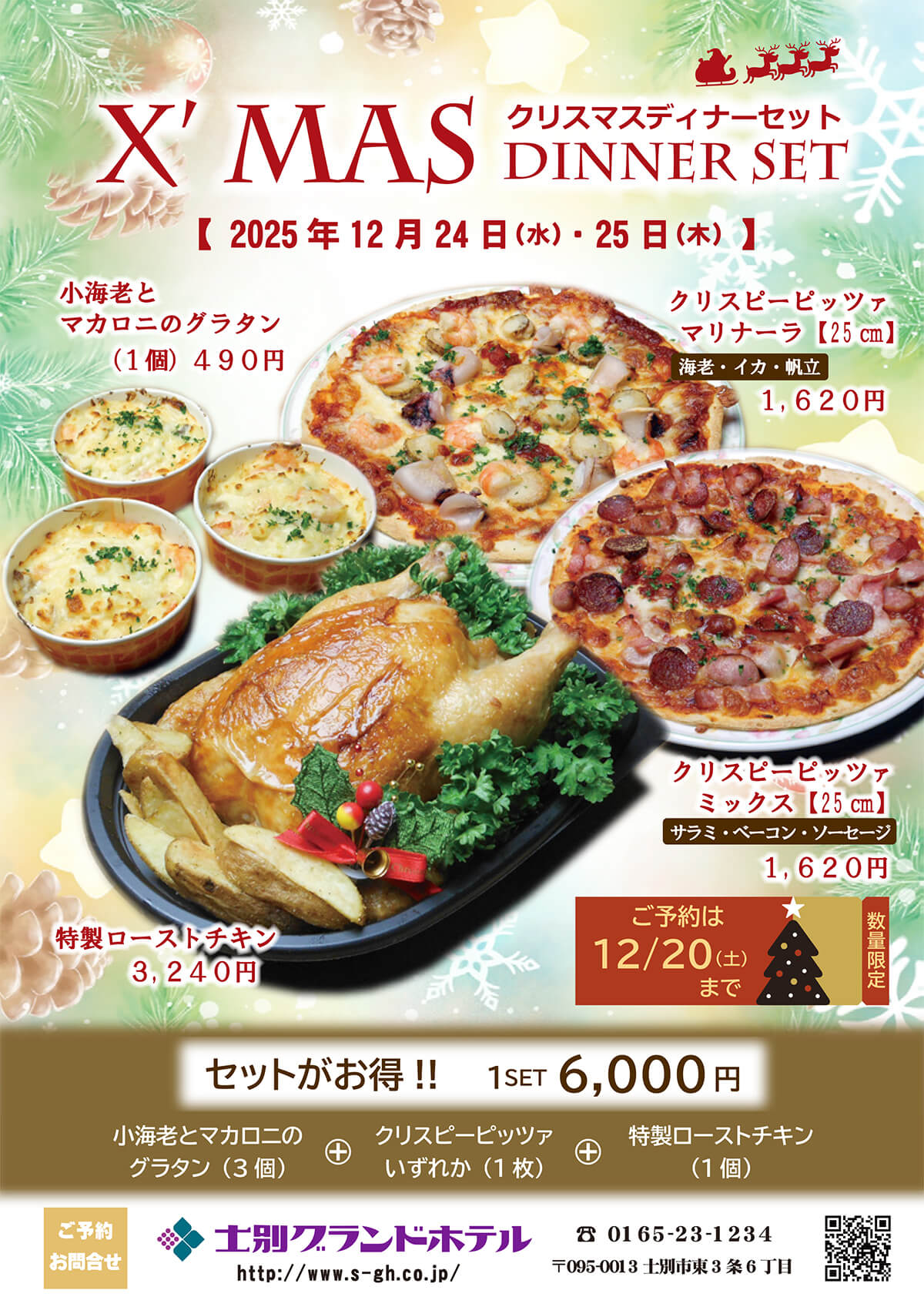 クリスマスディナーセット 特製ローストチキンをはじめとしたクリスマスディナーセットをご用意。 素敵なクリスマスのひと時をお過ごしください。 ※2,000円以上で士別市内近郊配達いたします。 前のページ おすすめ情報
